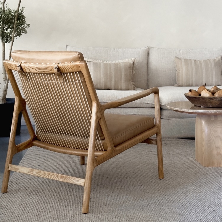 כורסה מעוצבת בסגנון נורדי-סקנדינבי, עם שילוב הרמוני של עץ טבעי ובד בהיר.