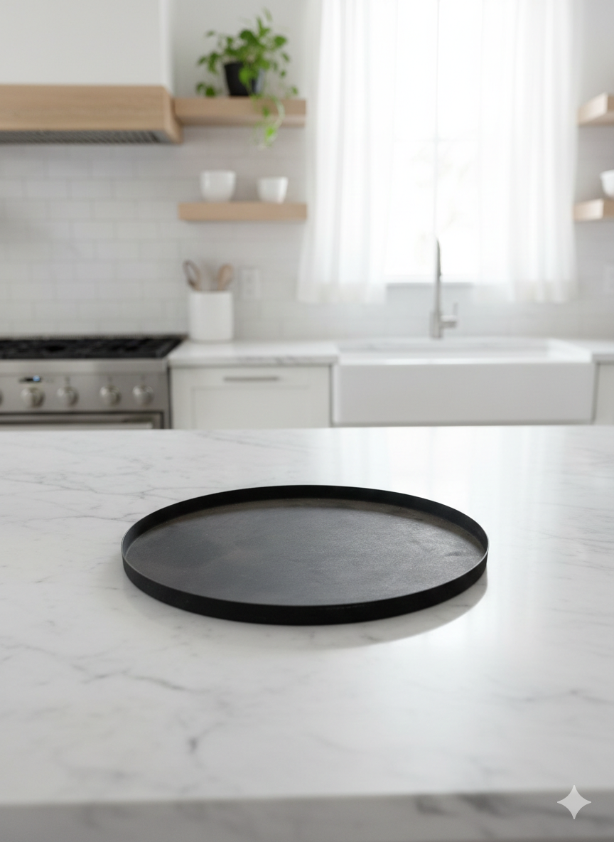 מגש עגול ממתכת שחורה בגימור חלק ונקי.