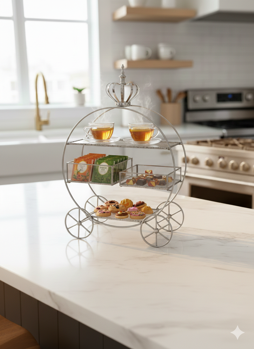 עגלת תצוגה דקורטיבית ממתכת בגימור כסוף, עם מדפים בעיצוב עגול ואלמנט כתר ייחודי.