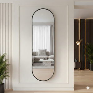 מראה אובאלית מעוצבת בגימור שחור יוקרתי, שמשלבת קווים רכים עם נוכחות אלגנטית ועל-זמנית.