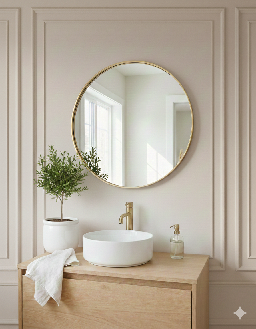 מראה עגולה מעוצבת בגימור זהב יוקרתי בקוטר 80 ס״מ, שמוסיפה אור, עומק ואלגנטיות לכל חלל.