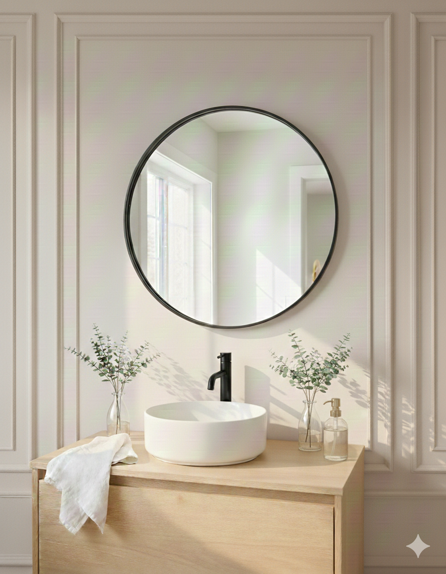 מראה עגולה מעוצבת בגימור שחור יוקרתי בקוטר 60 ס״מ, שמוסיפה אור, עומק ואלגנטיות לכל חלל.