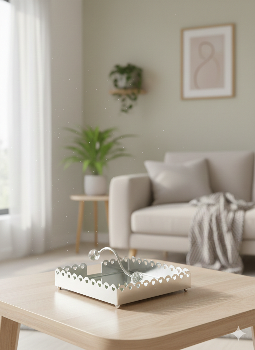 מתקן מפיות דקורטיבי עם בסיס מראה ומסגרת מתכת כסופה בעיטור לבבות עדין.