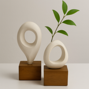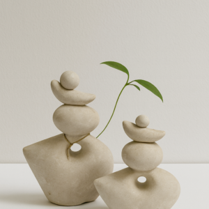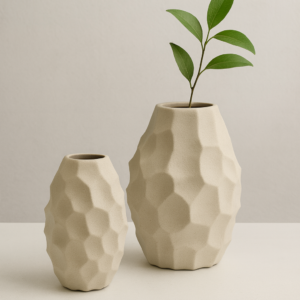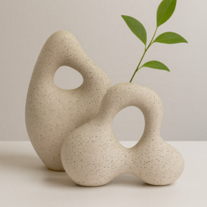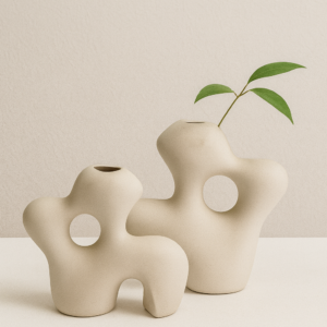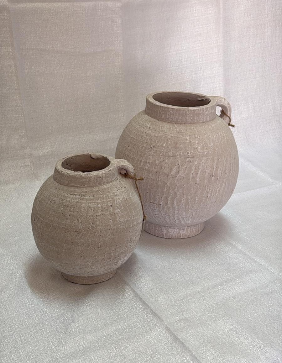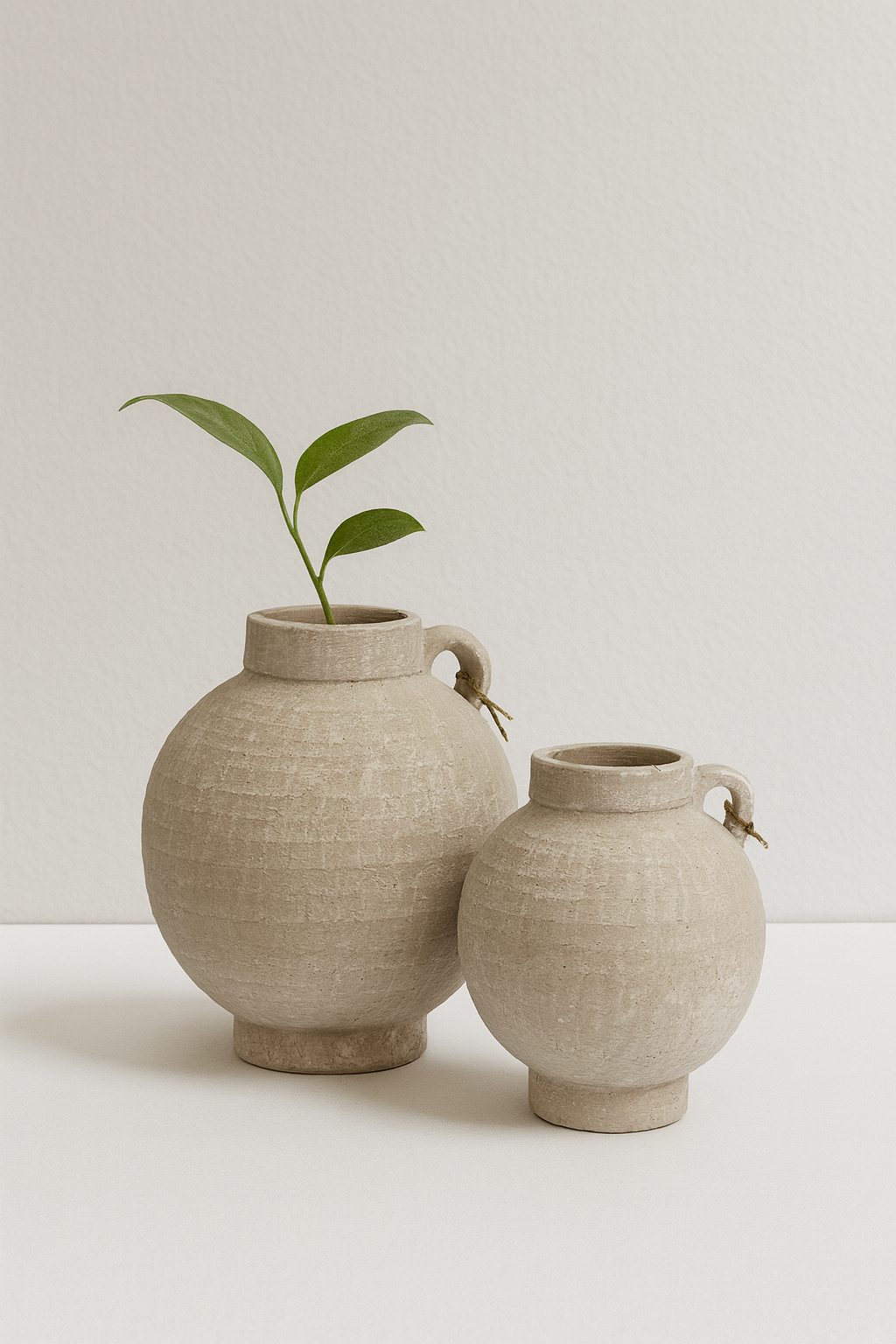 זוג כדים דקורטיביים מקרמיקה טבעית בעיצוב קלאסי עם ידיות עדינות ונגיעה ירוקה.