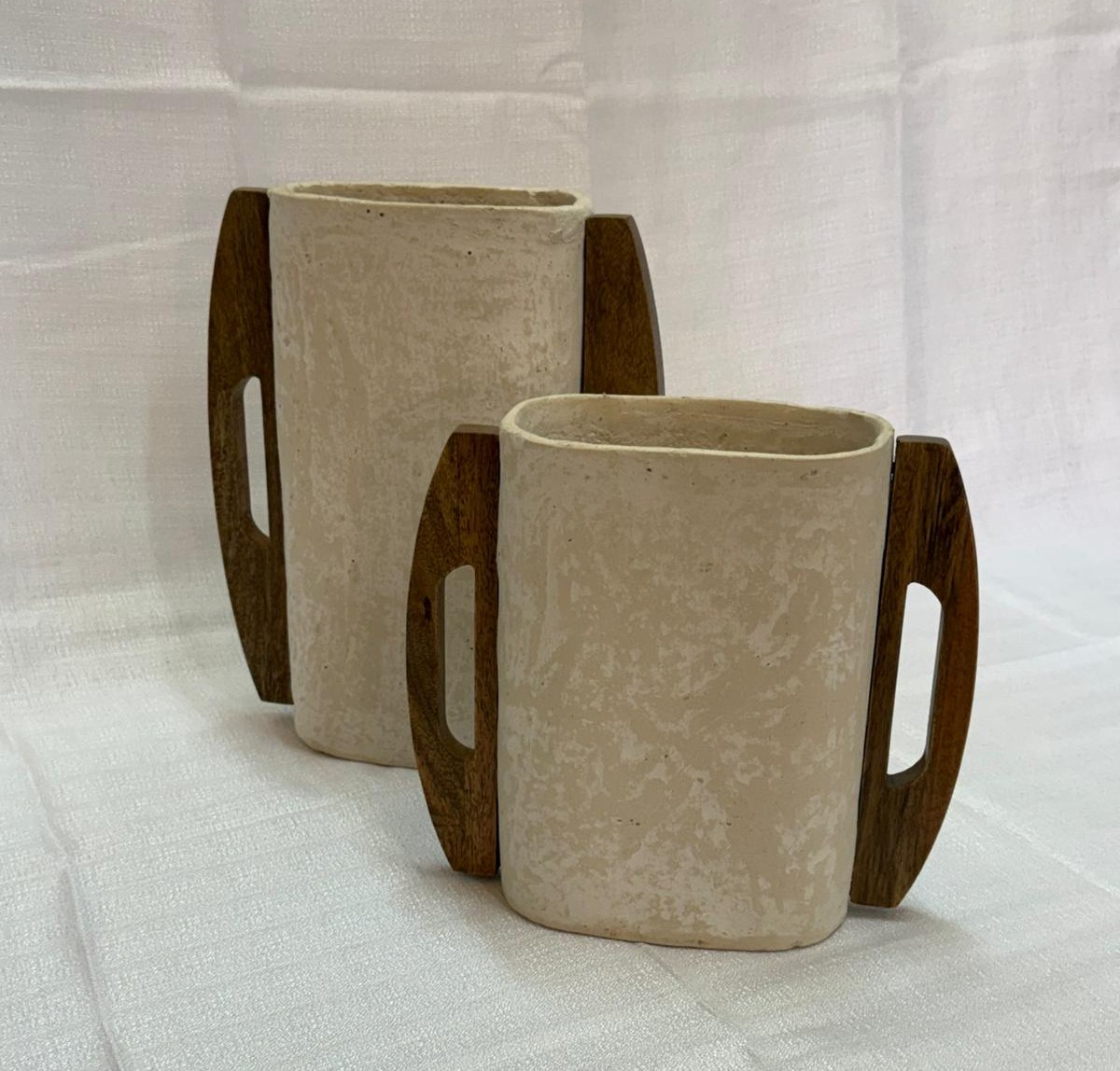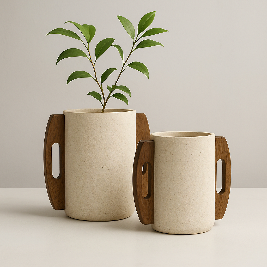 זוג כדים דקורטיביים מקרמיקה טבעית עם ידיות עץ אלגנטיות.
