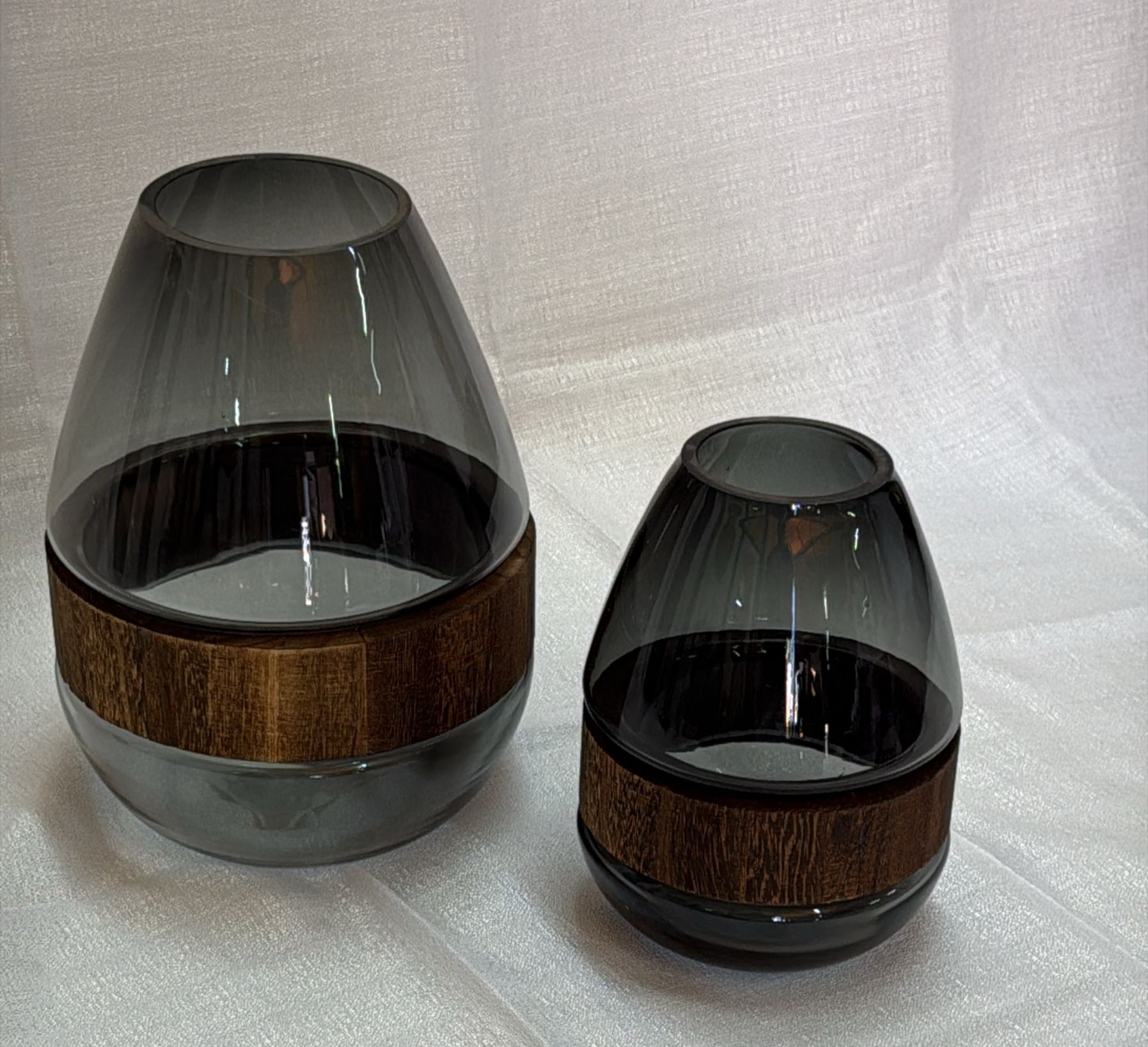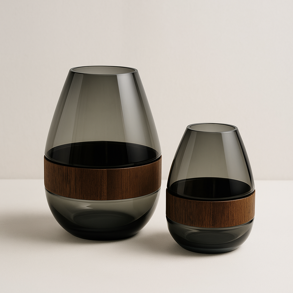 זוג כדים מזכוכית מעושנת עם טבעת עץ טבעית, בעיצוב עגלגל ונקי.