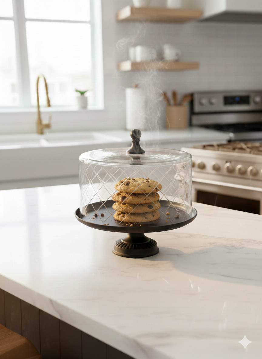 סטנד עוגה אלגנטי עם מכסה זכוכית שקוף ובסיס שחור קלאסי.