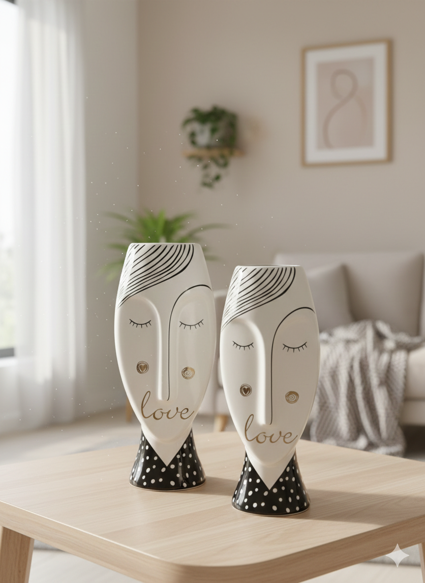 סט אגרטלים דקורטיביים בעיצוב פנים אמנותי, בגווני שחור־לבן עם נגיעות זהב וכיתוב עדין של LOVE.
