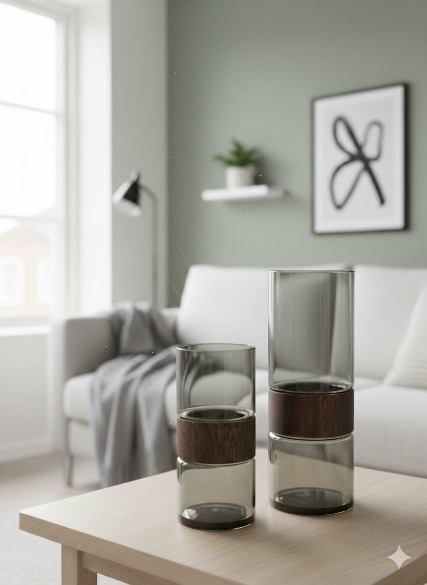 סט ואזות זכוכית בגימור מעושן עם חבק עץ טבעי, בשילוב אלגנטי ומדויק בין חומר חם לשקיפות מודרנית.