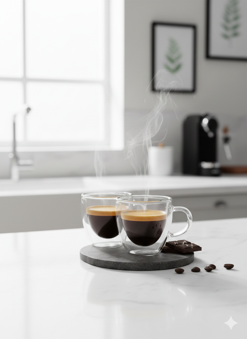 סט כוסות אספרסו מזכוכית כפולה, השומרת על חום המשקה ומונעת התחממות חיצונית.