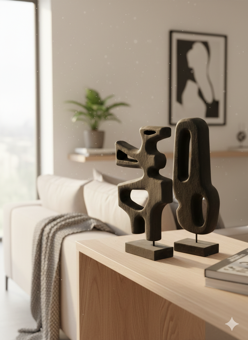 סט פסלים אבסטרקטיים בגימור כהה טבעי, על בסיסים נקיים ומינימליסטיים.