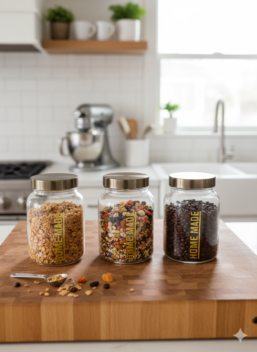 סט צנצנות אחסון מזכוכית עם מכסי מתכת, בעיצוב נקי ועל־זמני.