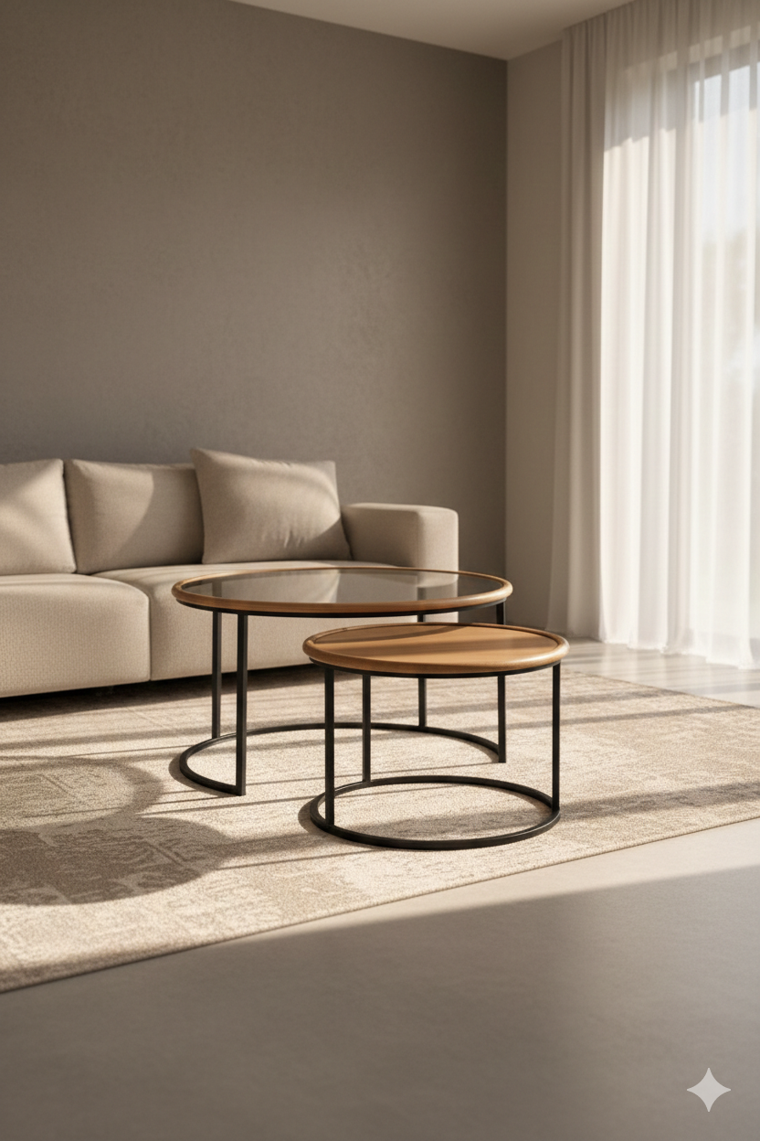 סט שולחנות סלון בעיצוב מודרני־ על־ זמני, המשלב קווים נקיים עם חומרים חמים ונוכחות אלגנטית.