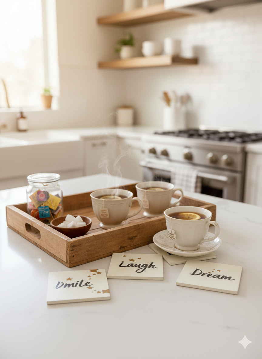 סט תחתיות לכוסות עם מילים מעוררות השראה, בשילוב קופסת אחסון מעץ טבעי.