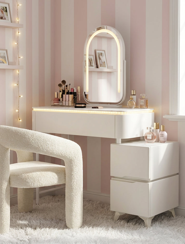 פינת איפור קומפקטית המתאימה במיוחד לחדרי שינה ולחדרים קטנים, ויוצרת אזור התארגנות מסודר ונעים.