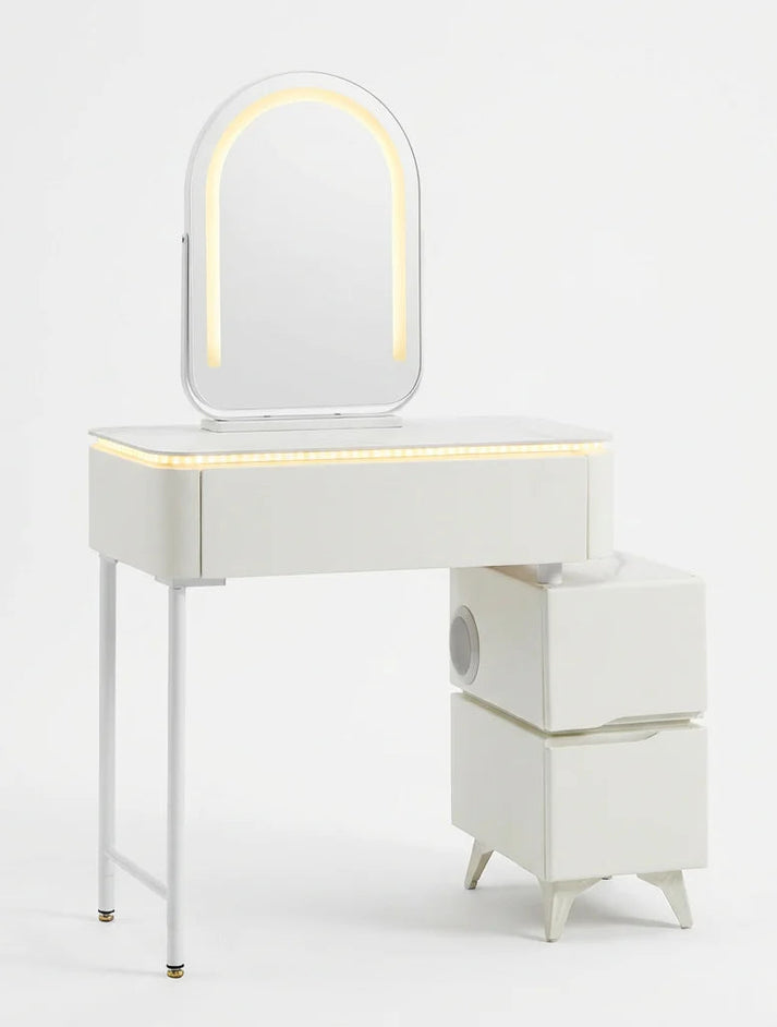 השידה כוללת שידת איפור עם מראה מעוצבת, תאורת LED פנימית במראה ופס תאורת LED לשידה – לאור אחיד ומדויק בזמן איפור והתארגנות.