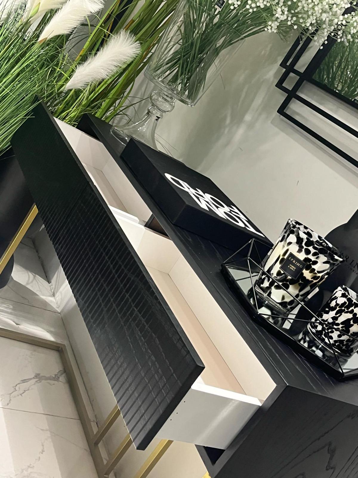 קונסולה בעלת 2 מגירות שחורות לאחסון בעיצוב מודרני.