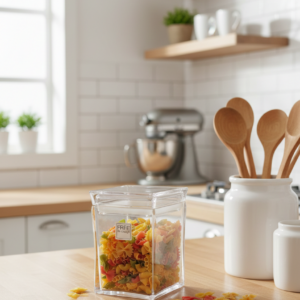קופסת אחסון מפלסטיק שקוף עם סגירת ואקום לשמירה על טריות לאורך זמן.