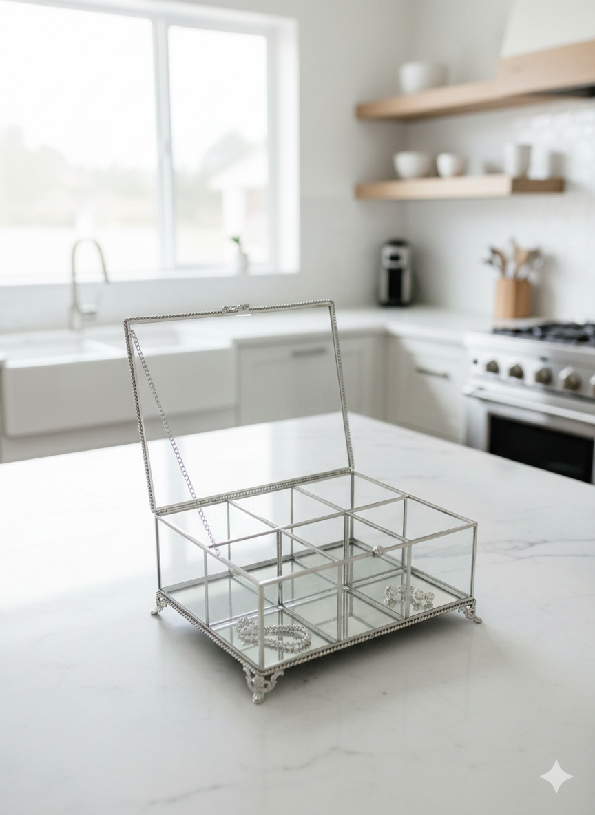 קופסת אחסון ותצוגה מזכוכית ומתכת בגימור כסוף.