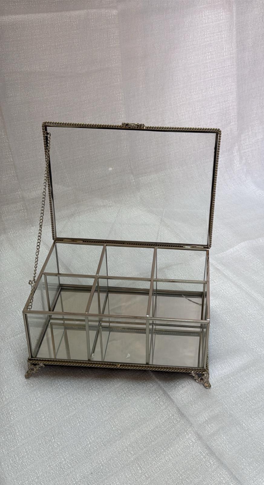 קופסה יוקרתית בעיצוב אלגנטי עשויה מזכוכית עם מסגרת מתכת דקה ומעודנת.