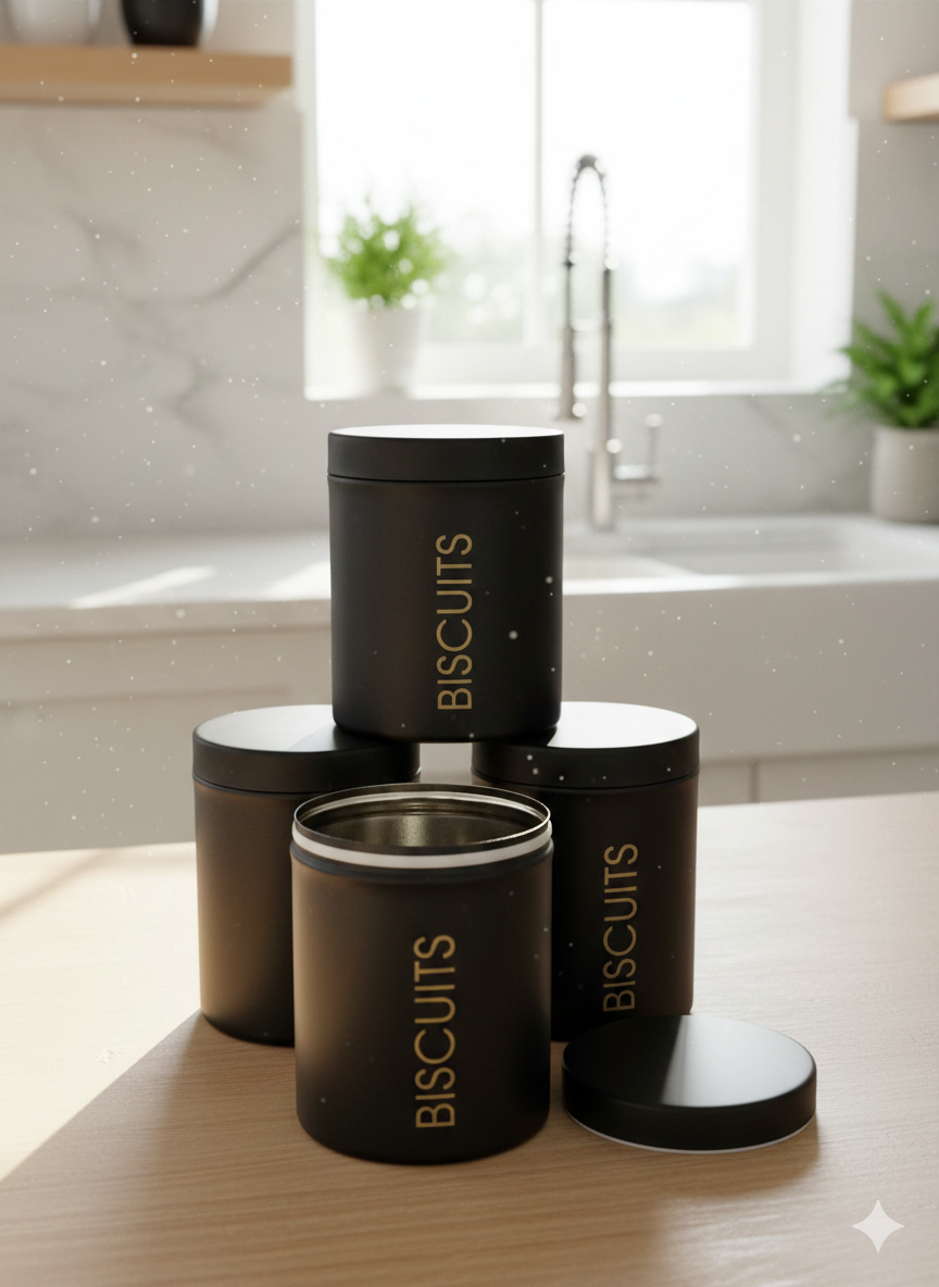 קופסת אחסון מעוצבת לעוגיות בגימור שחור מט עם כיתוב אלגנטי בגוון זהב.