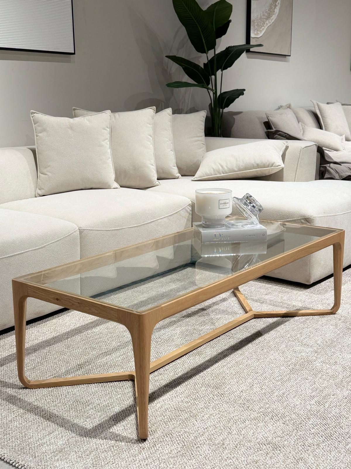 שולחן סלון אלגנטי בעיצוב נקי ומעודן, המשלב בין העץ לבין קלילות הזכוכית ליצירת איזון מושלם.