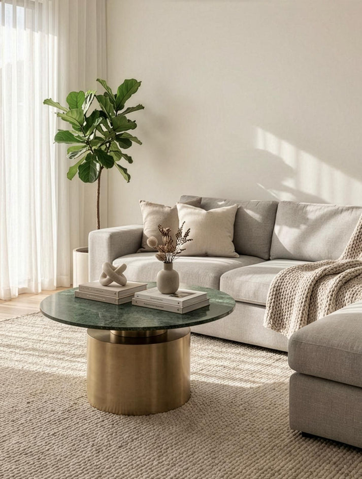 שולחן סלון יוקרתי המשלב פלטת שיש עגולה בגימור טבעי עם בסיס מתכת מאסיבי בגוון חם, ליצירת פריט עיצובי עוצמתי ומדויק. השילוב בין החומרים מעניק לשולחן מראה מודרני-על-זמני שמתאים לסלון מעוצב, חללי אירוח יוקרתיים ובתים של חובבי עיצוב.