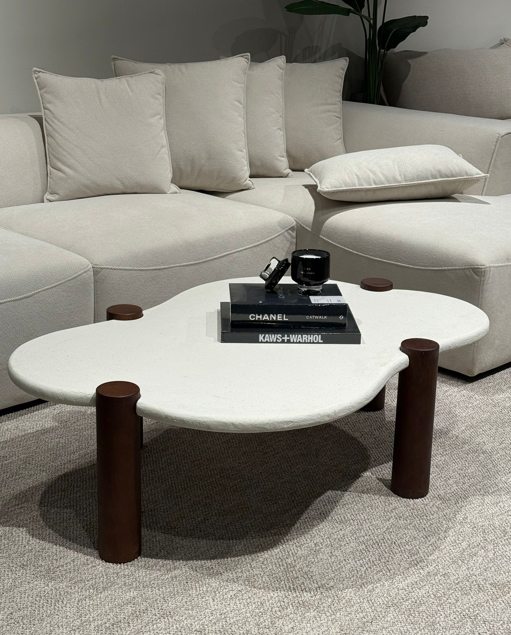 שולחן קפה ייחודי בעבודת גימור מוקפדת, המאופיין במשטח לא סימטרי