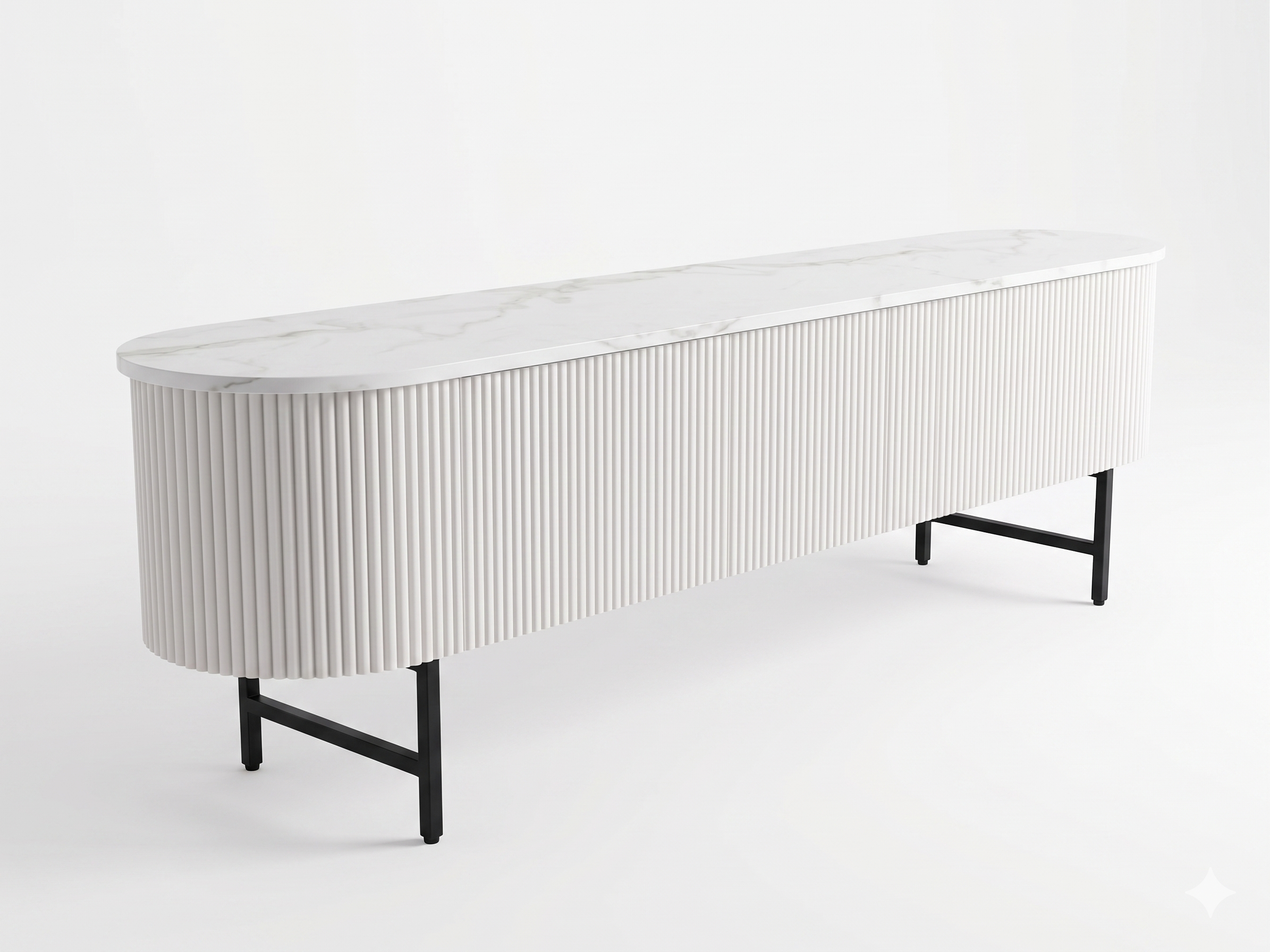 מזנון טלוויזיה יוקרתי ומודרני, עם קווים נקיים וצללית מעוקלת ייחודית.