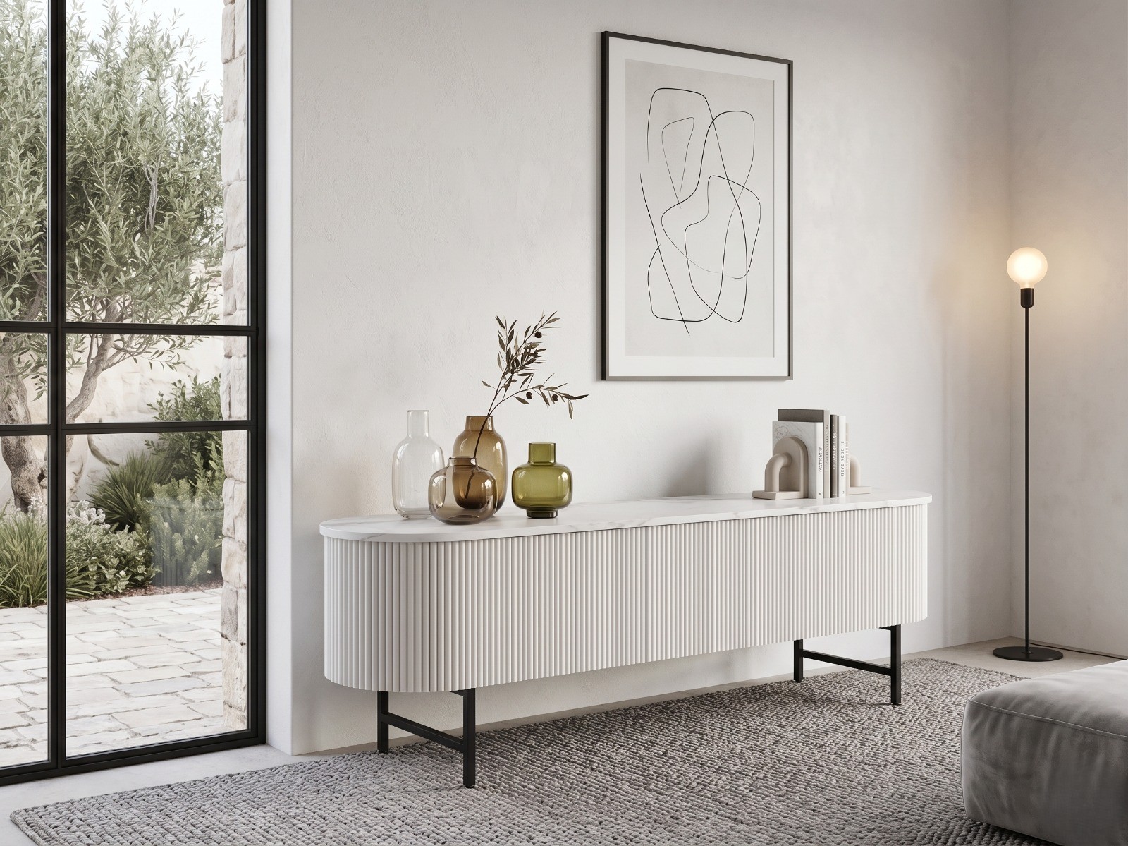 עשוי עץ בגימור לבן נקי עם טקסטורת פסים אנכיים בולטת (פלייטינג) המעניקה עניין ומרקם