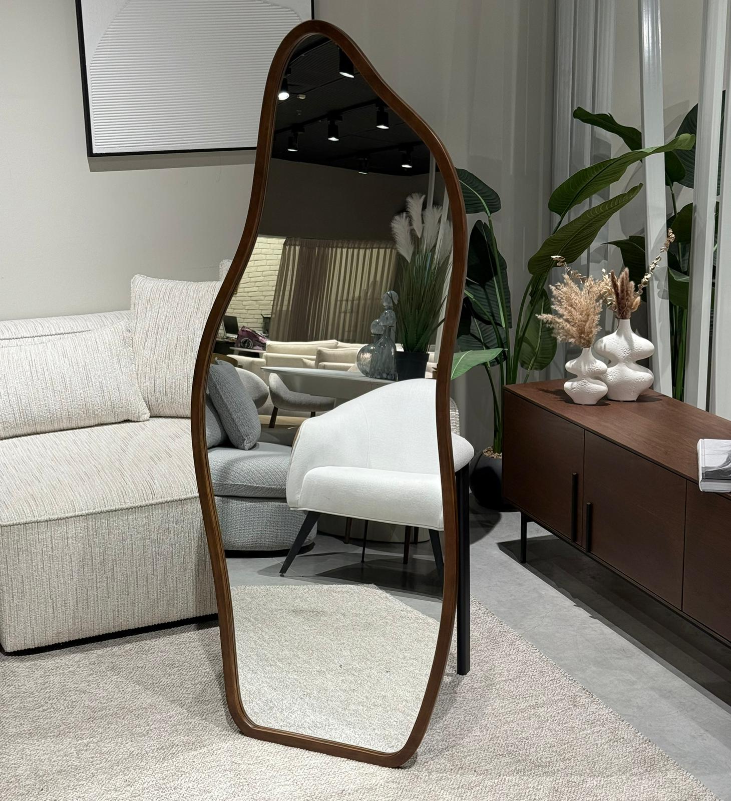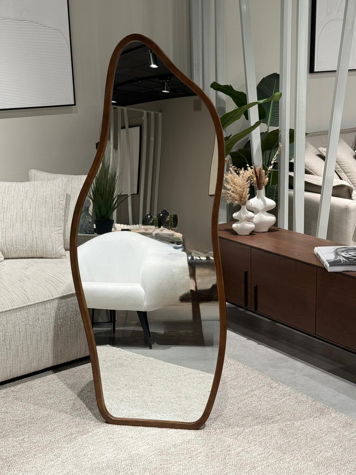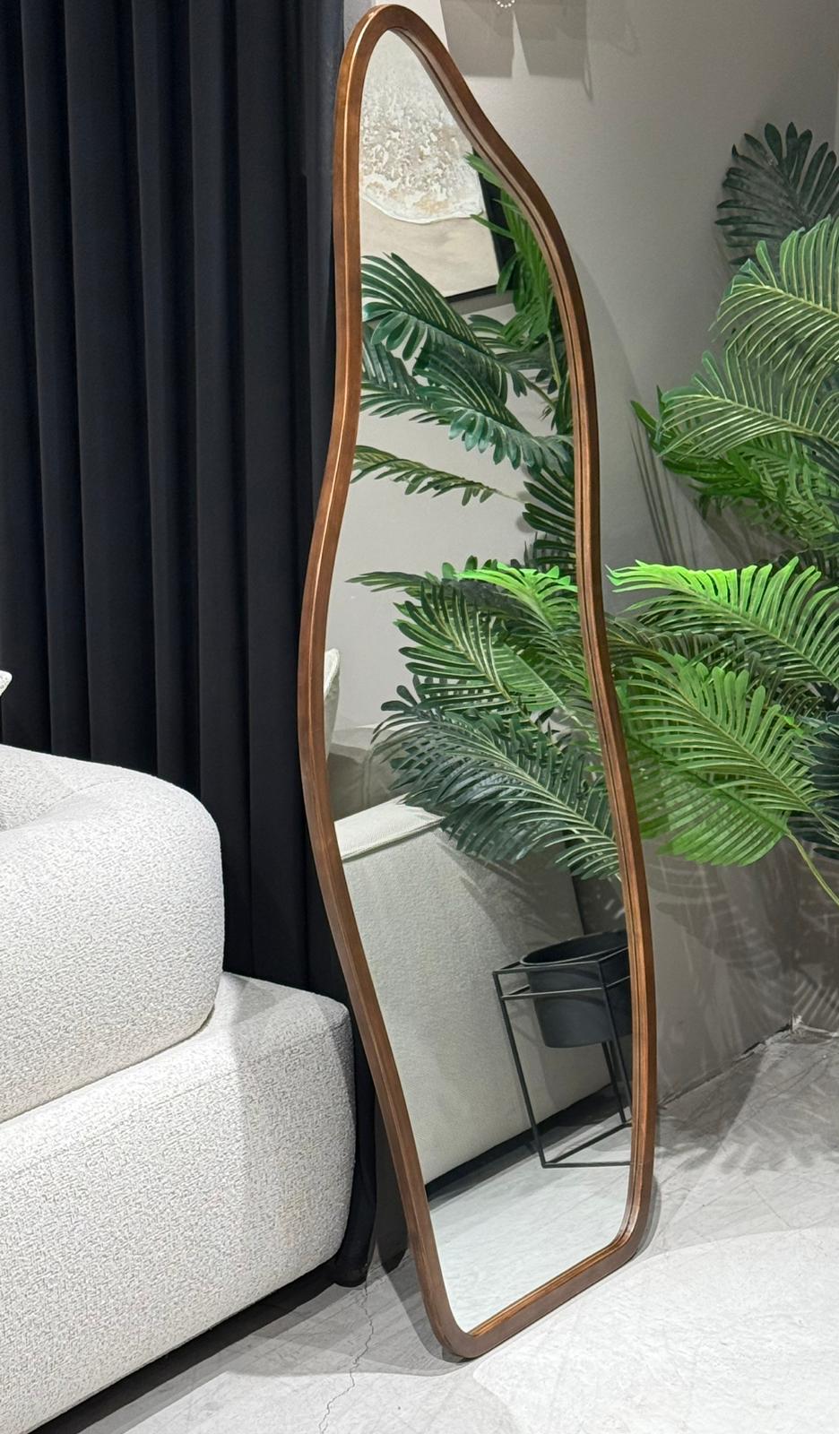 מראת גוף מלאה בעלת מסגרת עץ חמה ומעוצבת בקווים אורגניים,