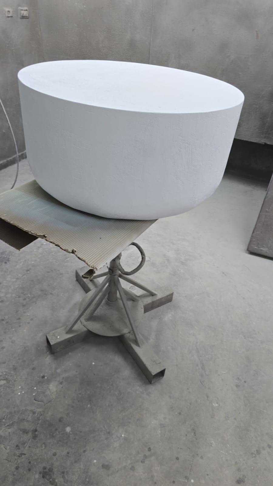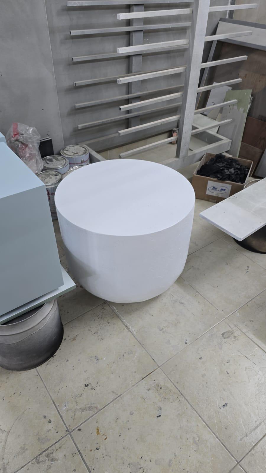 השולחנות מגיעים בצורת עיגול רכה ונעימה לעין, בגימור לבן בטון מחוספס בעבודת יד,