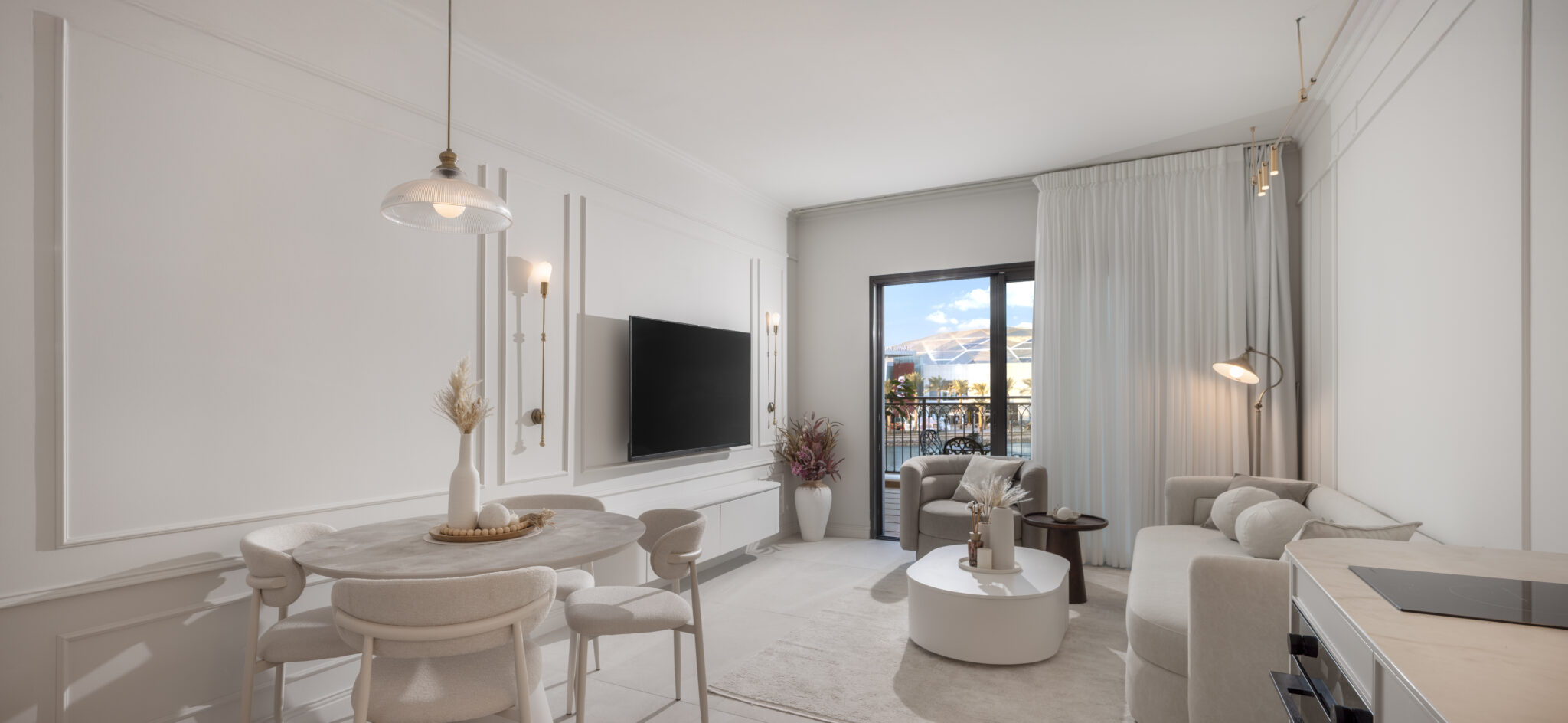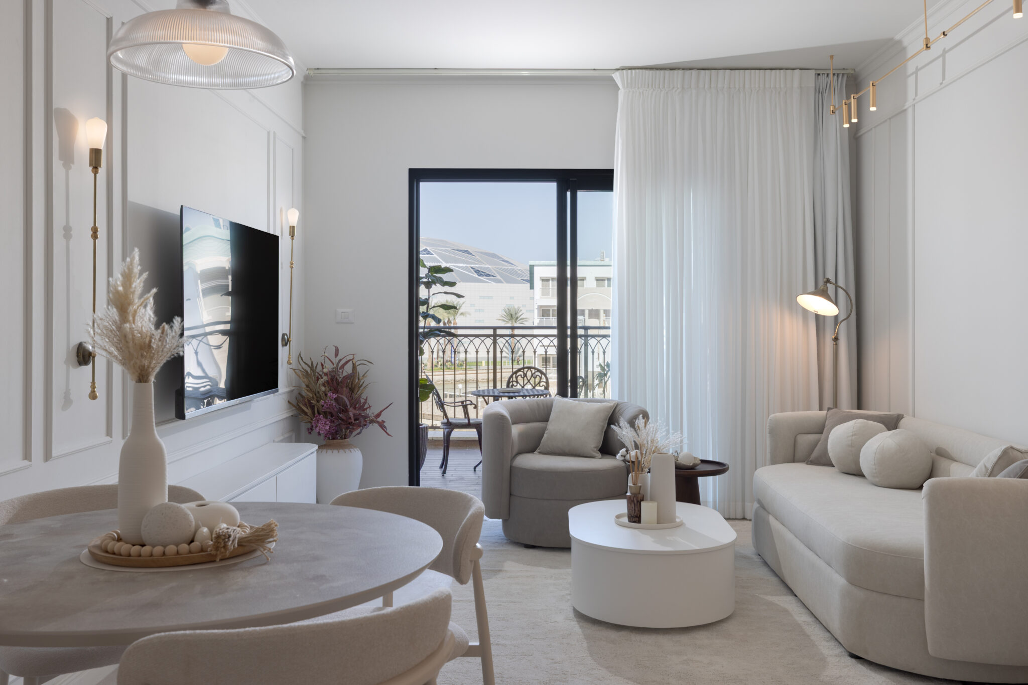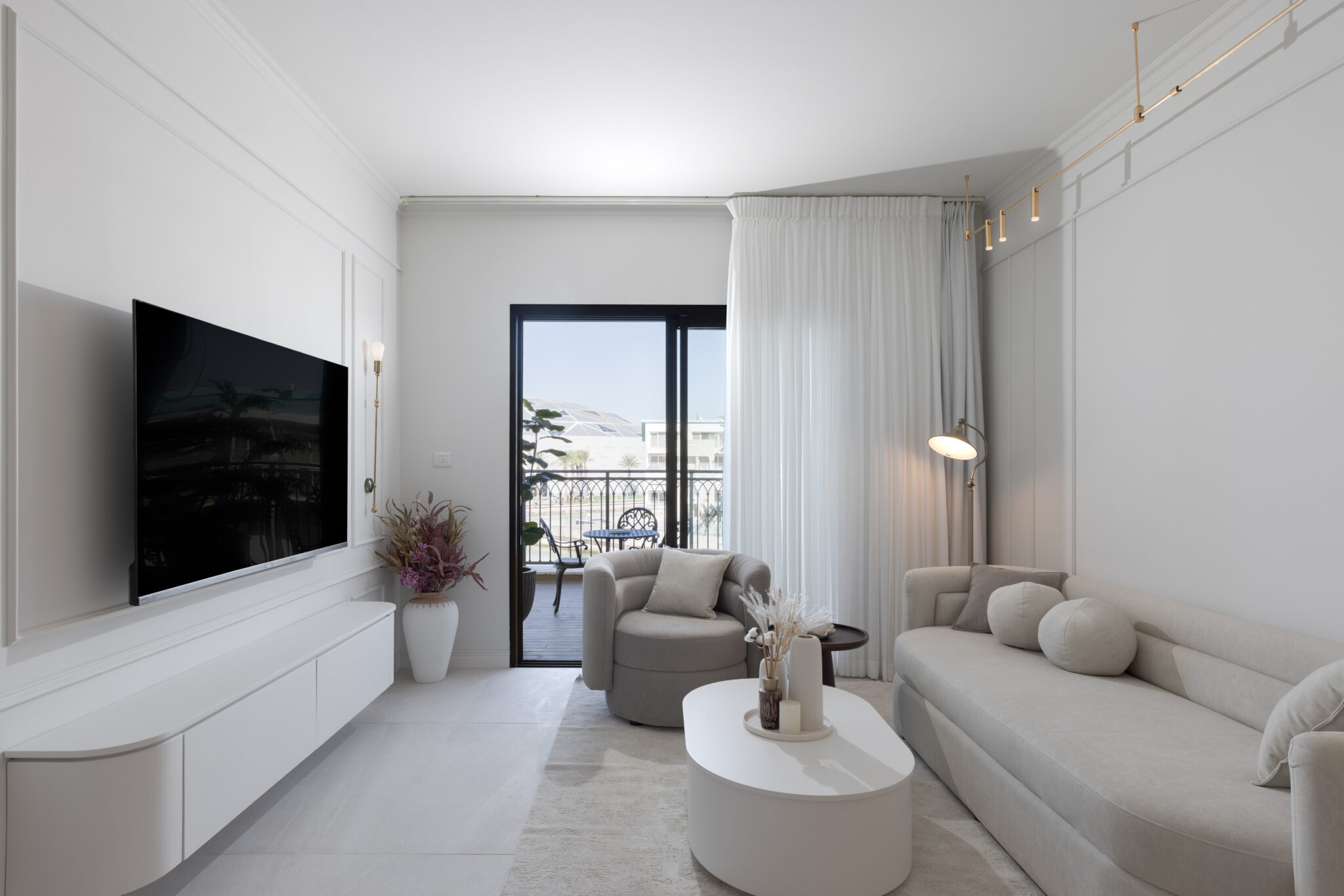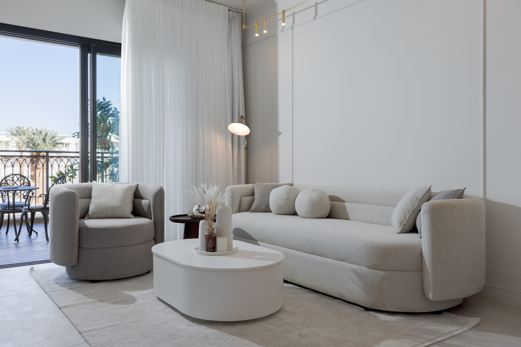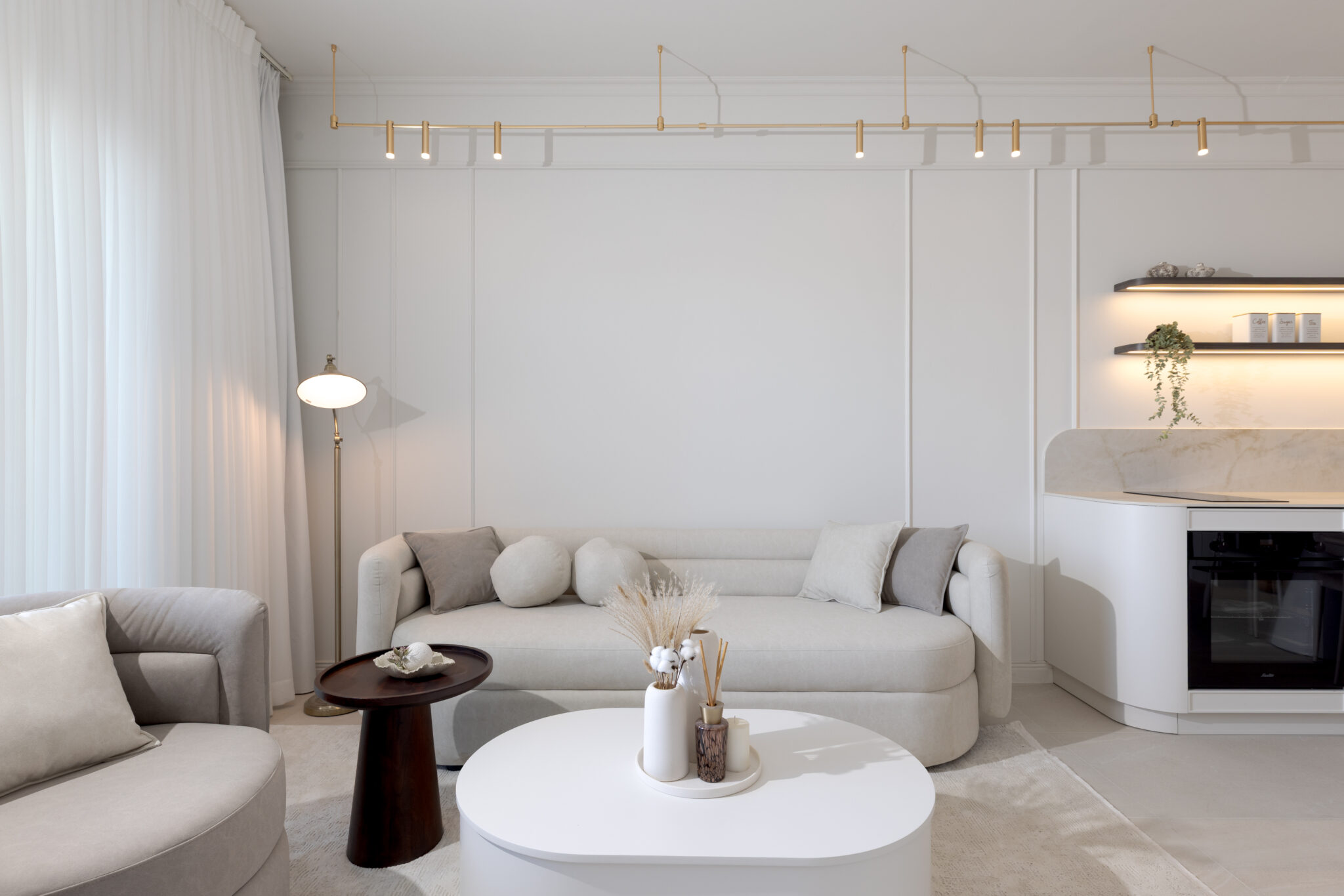 סלון יוקרתי בסגנון מודרני-על-זמני, המעוצב בקווים רכים ונעימים.