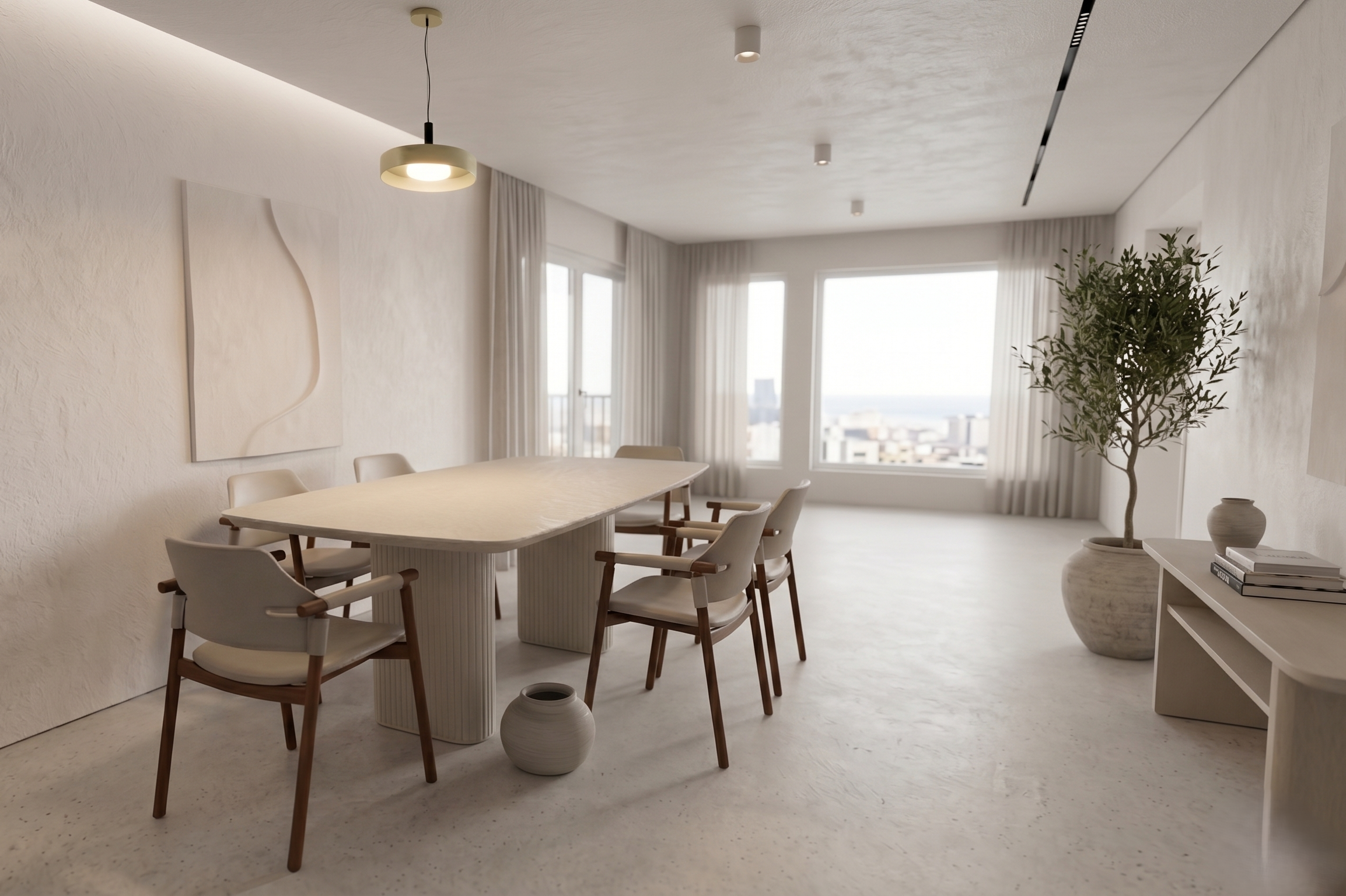 שולחן אוכל בעל טופ מעוגל בגימור טקסטורת דמוי טרוונטין טבעי
