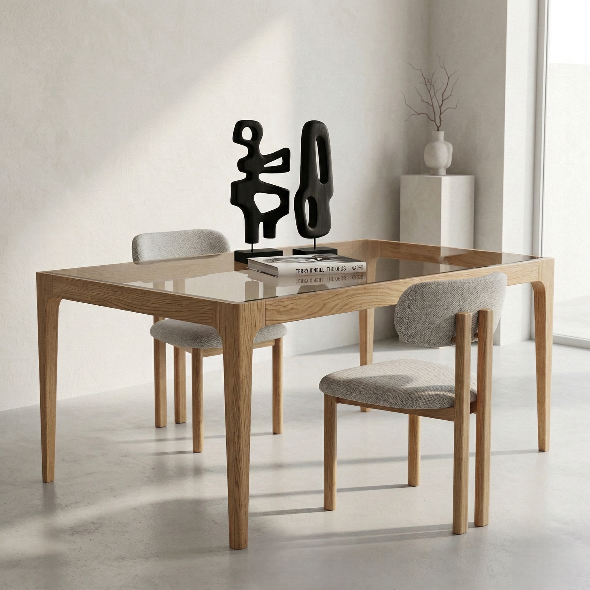 משטח השולחן מזכוכית ,היוצרת ניגוד יוקרתי לעץ הטבעי.