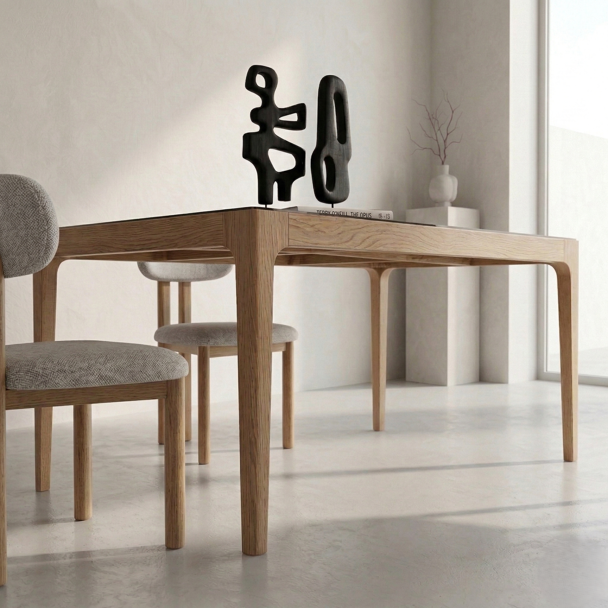 שולחן אוכל בעיצוב מודרני ונקי, עשוי מסגרת עץ מלא בגוון אלון עם