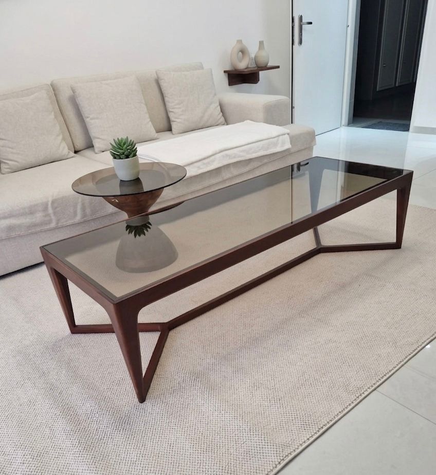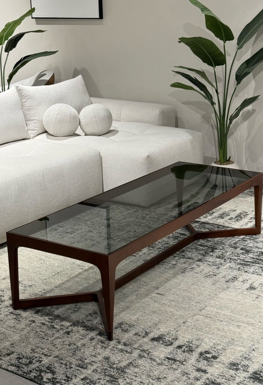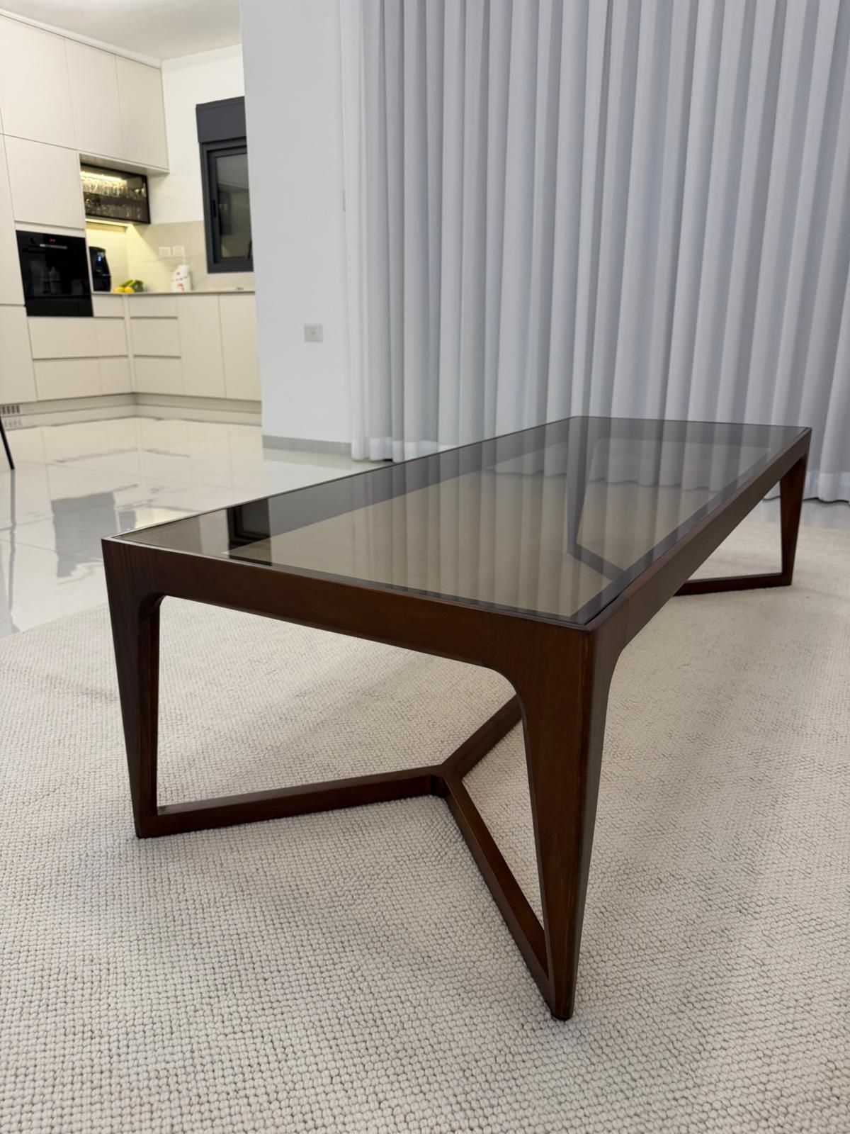 שולחן סלון אלגנטי בעיצוב נקי ומעודן, המשלב בין חום העץ לבין קלילות הזכוכית ליצירת איזון מושלם.
